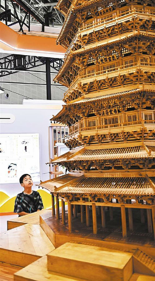 8月21日,小朋友在朔州市展区观赏应县木塔模型。杨晨玉摄(中经视觉)