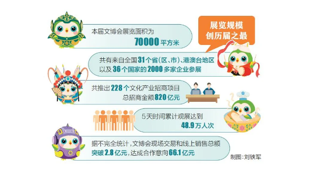 本届文博会展览面积为7万平方米,共有来自全国31个省(区、市)、港澳台地区以及36个国家的2000多家企业参展,展览规模创历届之最。共推出228个文化产业招商项目,总招商金额820亿元,5天时间累计观展达到48.9万人次。据不完全统计,文博会现场交易和线上销售总额突破2.8亿元,达成合作意向66.1亿元。通过打造集视觉、听觉、互动体验与交易功能于一体的文化展示空间,举办“山西文化地标”“山西文化科技融合发展”“山西省文化传承发展”典型案例发布活动,全方位、立体式展现了三晋文化的独特魅力,为推动全省文化繁荣和经济社会高质量发展注入了强劲动力。
