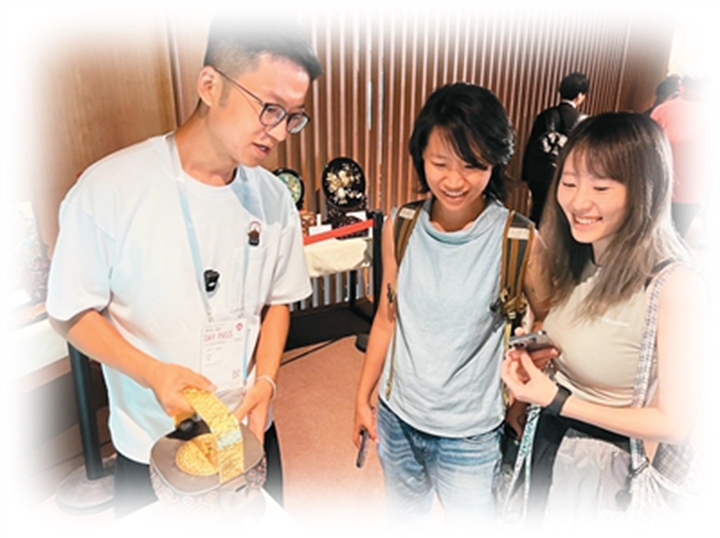 晋晓(左一)在日本大阪世博会向观众介绍“万华”铁壶。