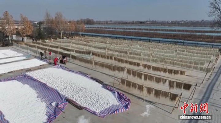 中新网运城1月10日电(高雨晴 武盈贝 董巨星)寒冬时节,在山西省万荣县裴庄镇岔门口村的粉条晾晒场上,一排排晶莹剔透的粉条随风摇曳。当地依托黄河滩涂优质红薯资源,将传统粉条进行加工,做成了带动群众增收致富的大产业。