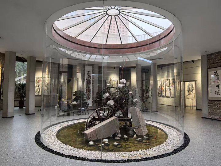 步入美术馆,浓浓的工业风扑面而来。老旧的厂砖、带着岁月痕迹的铁门被完整保留,曾经的生产车间如今变身艺术殿堂,废弃构件化身装置艺术品。一抹阳光下的玻璃景观内,一汪清水里鱼儿自在游动,枯寂的工业遗存与鲜活的生命形成奇妙对比。