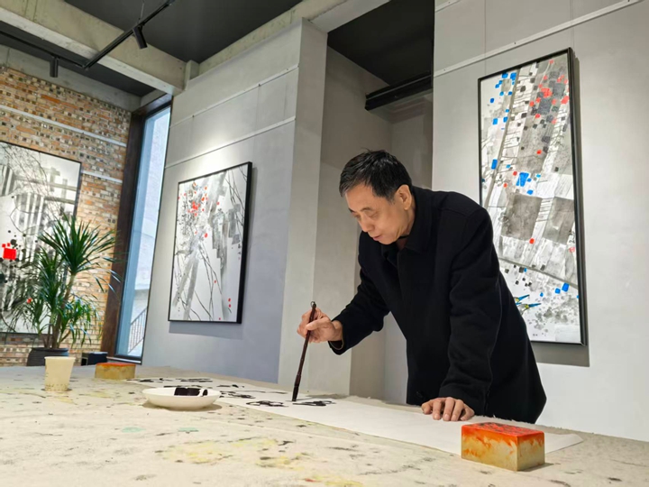 在一幅色彩明快的抽象作品前,他饶有兴致地讲解起来:“这幅画是受舒伯特《小夜曲》启发创作的,音符的跳动、旋律的起伏,我把它变成色块和线条。就像敲鼓有轻重缓急,画画也有节奏,有起有落才会产生美感。”