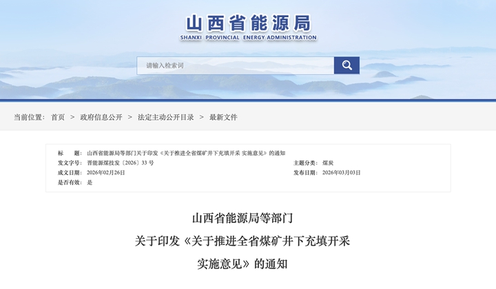 近日,山西省能源局、山西省自然资源厅、山西省生态环境厅、山西省应急管理厅及国家矿山安全监察局山西局联合印发《关于推进全省煤矿井下充填开采实施意见》(以下简称《实施意见》),旨在破解煤矸石处置难题,推动煤炭行业绿色低碳转型。