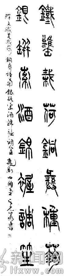 我认为,习篆当从小篆入手,并以认识篆字、理解字义为前提。篆书创作,不仅要切实把握好章法、篆法、笔法三个方面,还需广泛涉猎中国书法史、书法美学、国学、古文字学等相近学科,把书法的内涵、个人的理解和艺术的审美融会贯通,以提升书者的个人修养和书法作品之品位。
