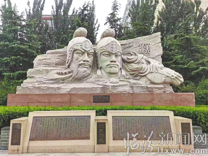 《大汉雄风》雕塑,坐落于临汾市区鼓楼北大街与解放路交会处的“双拥广场”,2017年清明前夕落成,是临汾首次为被称作“汉人精神符号”的卫青、霍去病塑造的艺术形象。这是著名雕塑家宿青平的杰作,用花岗岩雕造,高6.5米、长11米,雕塑形态庄重,他们并肩相依,威严深邃的目光正视前方,刚毅中闪烁着忠诚的家国情怀,沉思中折射出不畏强敌的雄才伟略。西汉时期,他们先后被汉武帝封为大将军,千里出塞,历时10年打败匈奴,收复河西走廊,为巩固西汉边境安全、开拓西部疆域、打通丝绸之路作出了卓越贡献。他们的雕塑头像后面,迎风高扬的大汉旗帜,融汇在祁连山脉、河西走廊,寓意他们伟大的历史功勋与山河同在,永垂不朽。雕塑右侧,耸立着12座青石碑,顶端是惟妙惟肖的马首,碑刻有“平阳骄子”“民族英雄”“一代天骄”“丝路先驱”“有气敢任”“河西神威”“铁血本色”“丰功伟绩”“国家栋梁”“河汾双雄”“少壮神勇”“将帅楷模”等灰色大字;雕塑左侧,同样耸立着12座青石碑,顶端依然是惟妙惟肖的马首,碑刻有“身卑功高”“骠骑将军”“雄才伟略”“威震天下”“气壮山河”“彪炳史册”“浩然千秋”“捍卫和平”“万古流芳”“中流砥柱”“转战万里”“千里出塞”等灰色大字。灰色,象征着诚恳、沉稳、考究。久久凝视着马首,我仿佛看到残阳如血浴大旗、仿佛听到北风萧萧战马嘶,那弥漫的硝烟、闪光的战刀、震天的杀声,在耳边此起彼伏……