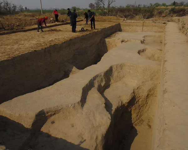 记者来到正在发掘的现场,这是陶寺早期宫殿区(小城)发掘探沟。两名技师、七位村民正在进行取土和发掘清理工作。据介绍,已经发掘的部分疑似“宫城”南门,可能有瓮城,但没有完全暴露出来,还需要取土扩方。