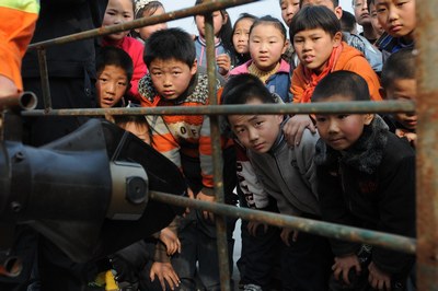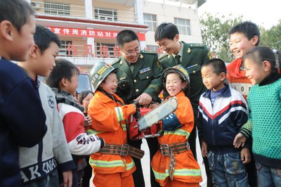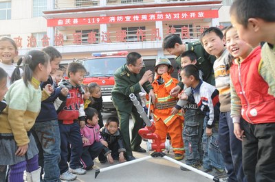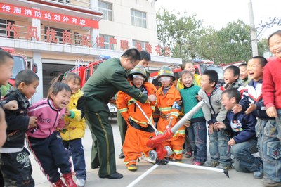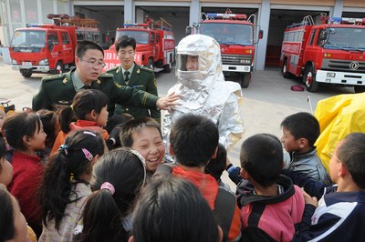 11月7日,小朋友穿上了消防战斗服。当日, 山西省临汾市曲沃县南街小学的老师和孩子走进消防队,参加该县消防大队举办“关注消防、珍爱生命、共享平安”消防站对外开放活动。消防官兵为老师和孩子们讲解、演示火灾逃生的方法,并展示消防装备,增强师生的消防安全意识和自救能力。 (本报记者李虎威摄)