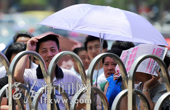 6月7日,一年一度的全国高考拉开大幕,今年全市共有36056名学子报名参加高考,考生总数再次下降,比2010年减少了4189人,全市共设17个考区、39个考点、1219个考场。当日最高气温37℃,考生高温迎战高考。高考是全社会非常关注的一件大事,广大考生和家属都不敢有丝毫懈怠,陪考已成常态。学生在考场内奋笔疾书,陪考的家长们在考场外也备受“烤”验。
