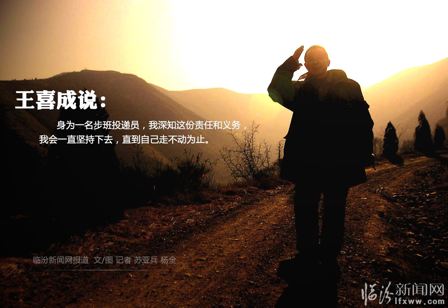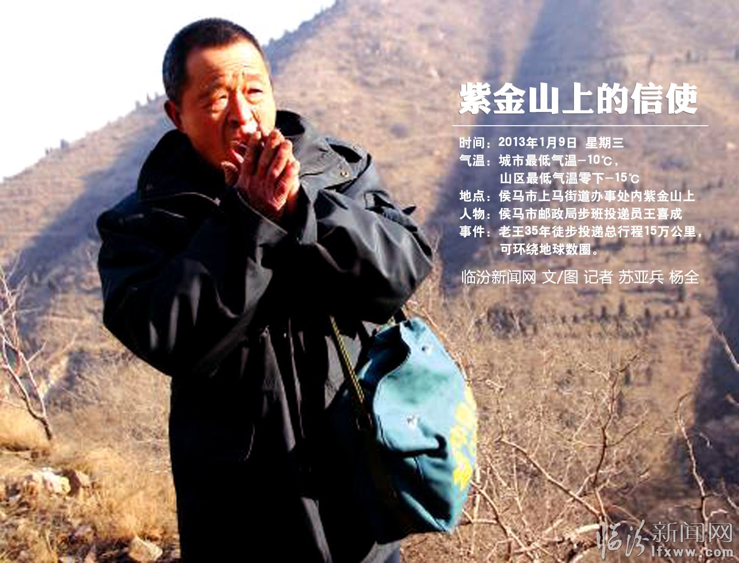 侯马境内紫金山上,有一位年已六旬的老人,35年间风雨无阻,徒步而行,为居住在山间村落里的百姓投递信件,用实际行动感动着这里的人们。这位老人名叫王喜成,是目前临汾境内唯一一个步班邮政投递员。1月9日,记者驱车至紫金山下,与王喜成同步而行,用镜头与文字记录下了这位大山信使的点点滴滴。