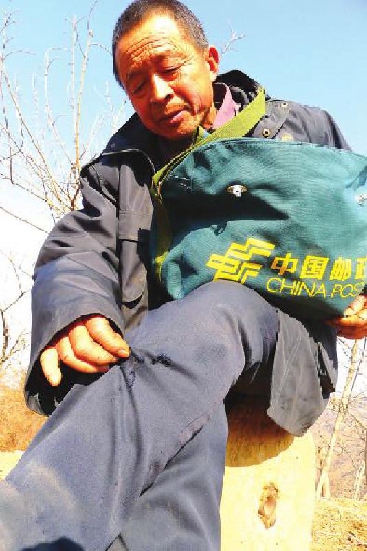 顺山而上,沿途皆是风化的石堆和野生的杂草,偶尔可以看到几棵不知何年月种下的柿子树,因为地域偏僻,无人上山摘采,满树的柿子已经挂在枝头上风化成了果干。“山上人少,路不好铺,所以一直没有人愿意给山上修路,事实上,这几年山上的住户越来越少,很长的时间里,沿途一路,只有我这个信差从山的这头走到山的那头,年复一年,月复一月。”王喜成说,因为所投递的邮件和报纸实在少的可怜,所以他在得到客户的许可后,每两日才投递一次,大山里的人淳朴,知道自己投递不易,几十年间,从没有人要求自己按时按点,也因为大山人的淳朴,所以自己从不放弃,哪怕数十里山路只为一封书信,他也照送不误,从不耽搁。