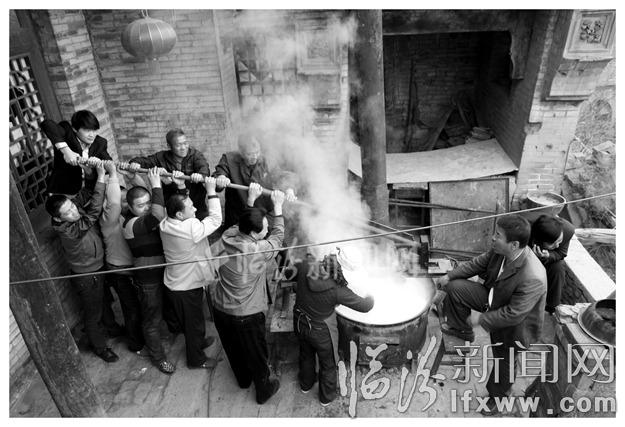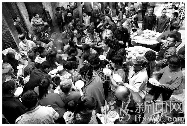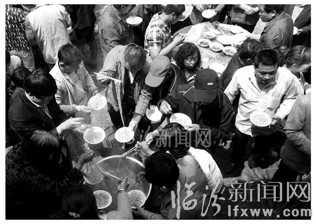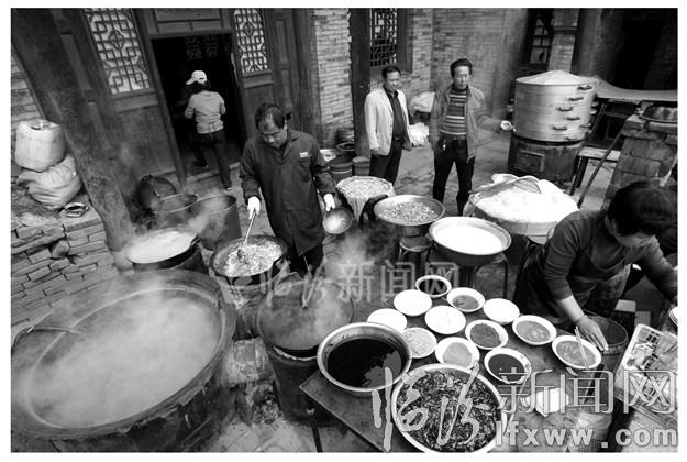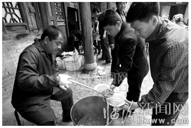 山西省临汾市的霍州市,这里有一位常年游走乡村的厨师叫李香龙,他今年45岁,是下乐坪村人,十几年前,他置办下一套锅碗瓢盆桌子板凳,领上妻子开始在方圆几十公里内为过事的村民做宴席,由于他的厨艺好,人缘也好,每年都会有100多人家请他去做宴席,他对当地人们爱吃的面食“河涝”做的更是出色,色味香俱全,许多人吃了他做的“河涝”后,赞不绝口,每当他的“河涝”一出锅,便被村民们疯抢,场面壮观,让人看了赞叹。