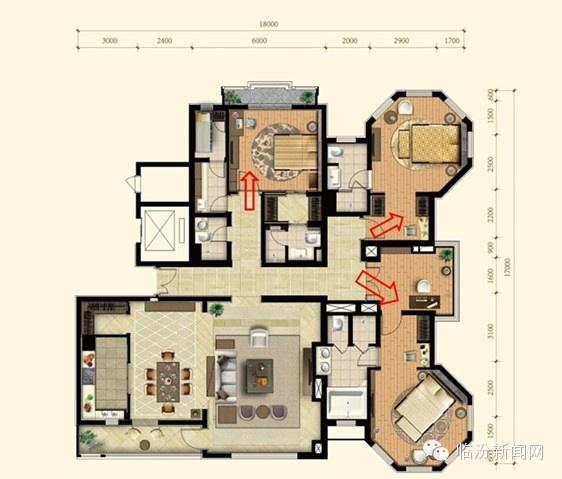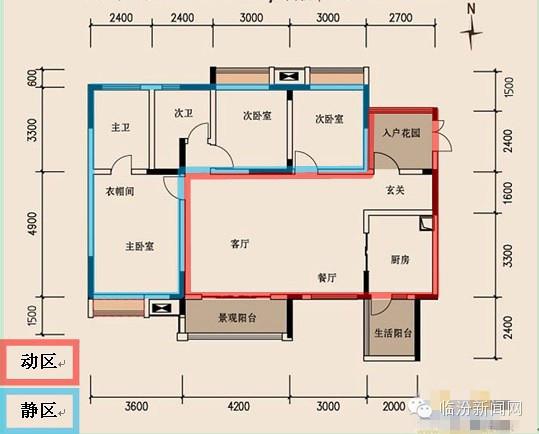 动静分区:动区是人们活动较为频繁的区域,应该靠近入户门设置,尤其是厨房;包括客厅、餐厅、厨房、卫生间为动:而静区主要供居住者休息,相对比较安静,应当尽量布置在户型内侧,包括卧室、书房为静。两者分离,一方面使会客、娱乐或者进行家务的人能够放心活动,另一方面也不会过多打扰休息、学习的人,减少相互之间的干扰。范例如下: