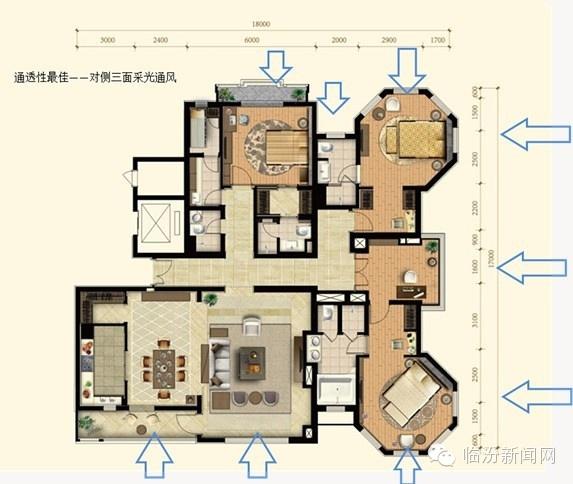 通透性主要是指户型的通风和采光性能。要保证户型具有良好的通透性能,首先要求户型要有良好的进深开间比,即户型比较方正;其次户型最好有两面可以采光和通风,相对两面采光通风最佳(如南北、东西),其次是相邻两面采光(如东和南、南和西、西和北等),只有一面采光通风效果最差。另外厨房厕所是湿气比较重的两个区域,要尽量做到独立采光通风,也就是避免暗厨暗卫。