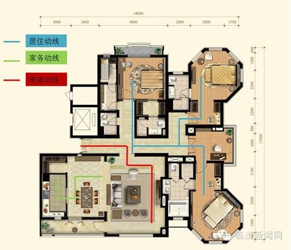好的动线能够提升户型利用率,而差的动线会使大户型变得“大而无当”,浪费空间。户内主要动线有三类,分别是居住动线、家务动线、来客动线。