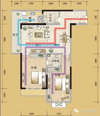 动线良好(从入户门进客厅、卧室、厨房的三条条线不会交叉)范例如下: