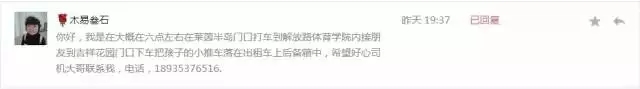 网友:@木易叁石 向本网反映,7月17日下午6点左右,在莱茵半岛门口打车,到解放路体育学院内接朋友。在吉祥花园门口下车后,不小心把孩子的小推车落在出租车上后备箱中,希望好心司机大哥看到后联系他本人。