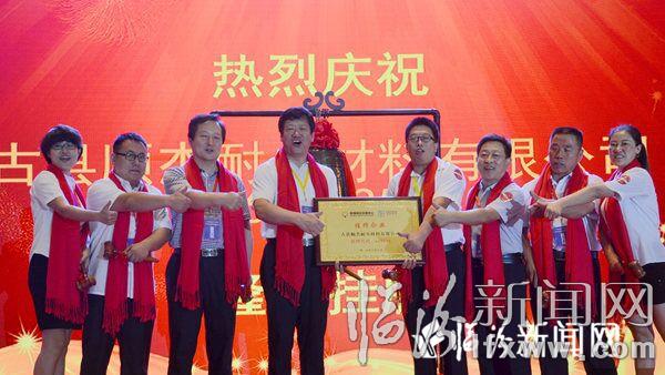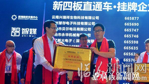 古县耐火材料有限公司负责人魏峰杰接过“新四板”企业代码牌