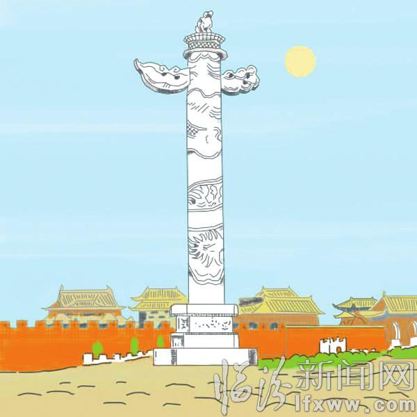 尧最初设置的诽谤木,只是一段木头,或许为了能够敲击发声,还是一段腹枯肚空的木头。后来这木头成为完整的一根柱子,而且光洁滑亮;再后来这木头还雕上了云纹,还有一条龙;后来,竖木上有了横木,而且上头有了飘逸的云团;最后这诽谤木设在了城边,而且路口、墓前也有了。据记载,汉代始用华表作为通衢大道的路标,竖立在十字道口,指示车马行为的前进方向。北宋大画家张择端画的《清明上河图》中汴梁虹桥两端就画有四柱华表。华表作为墓表,也称神道柱,乾陵、南京六朝陵墓前都有了。木头的变成了石头的,以致变成了现今屹立在天安门前后的华表。