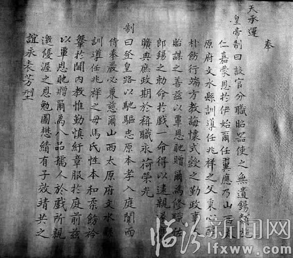 日前,一位好友告知,他发现了一份乾隆年间的圣旨,并发来了照片。记者通过整理发现,这是1737年(乾隆二年三月六日)乾隆皇帝对太原府文水县训导任兆祥的父母任翼应夫妇的表彰通报。