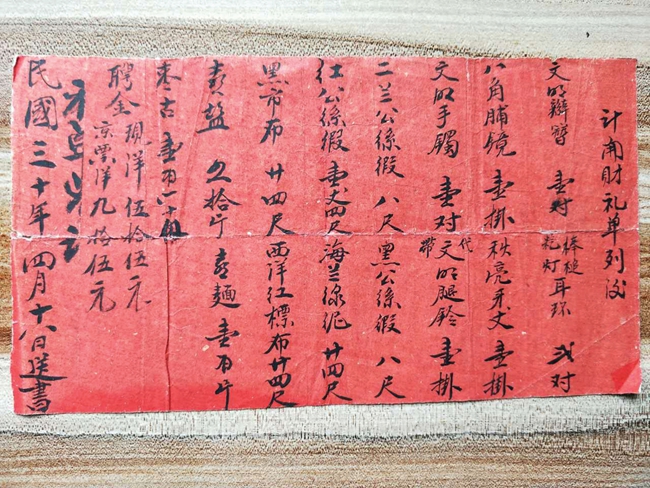 该彩礼单为红色纸张,虽然中间有皱褶,但内容无损坏,整体保存完好。彩礼单长21厘米,宽11.5厘米,内容为毛笔书写,字迹疏密有致,潇洒飘逸,如同一幅精心创作的书法作品。