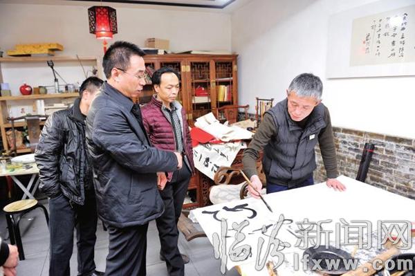 临汾新闻网讯 1月12日,在襄汾县丁村刘兴尧书法工作室,刘兴尧(右一)在和书法爱好者交流草书书写经验。随着书法这一传统文化的发展,许多书法家走出繁华的都市、走进农村,成立个人工作室,静下心来,创作作品,潜心研究书法,提高造诣,促进我市书法事业的繁荣和发展。