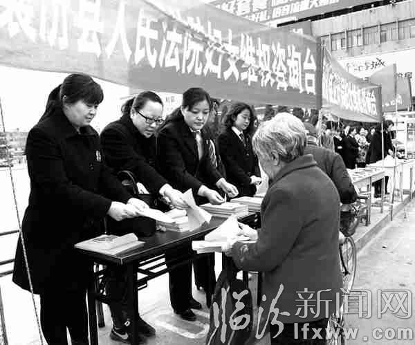 临汾新闻网讯 日前,为进一步深化妇女法制宣传教育,提升妇女维权意识,襄汾法院挑选6名经验丰富的女法官参加县妇联组织的以“建设法治襄汾·巾帼在行动”为主题的“三八”妇女维权周活动。法官们通过悬挂横幅、设立咨询台、发放资料等形式积极开展法制宣传。咨询台前,过往群众络绎不绝,女法官们耐心细致为前来咨询妇女儿童维权问题的群众答疑解惑。 贺莹 摄