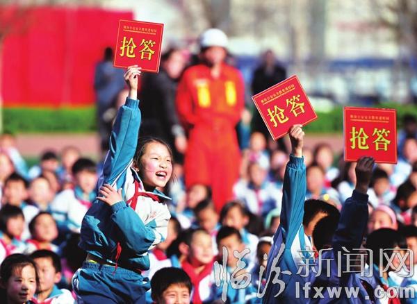 临汾新闻网讯 3月31日,在襄汾县第三小学,学生们正在进行消防安全知识抢答。清明节临近,该县公安消防大队针对祭扫、焚烧活动多的特点,在辖区内开展“平安和谐伴你成长”进校园讲安全活动,旨在通过“小手拉大手”方式减少安全隐患。