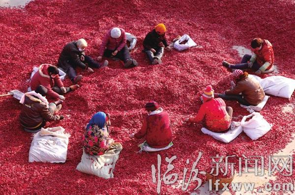 临汾新闻网讯 12月17日,在襄汾县赵雄村村民赵宝柱家的院子里,村民们正在帮忙摘辣椒。赵雄村是当地有名的辣椒种植村,每到辣椒交易旺季,家家户户都是一片火红的景象。 (张旦)