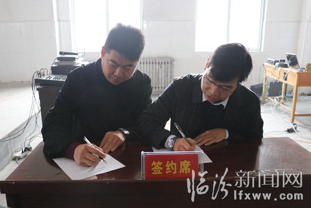 北京国商集团代表正在与襄汾县电商管理协会秘书长张铁签约苹果采购意向书