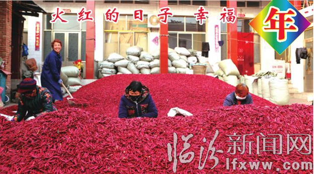 图为2017年12月26日,襄汾县赵康镇赵雄村的椒农们在忙着晾晒、装袋、过秤、装车,准备销售辣椒。 王辉耀 摄