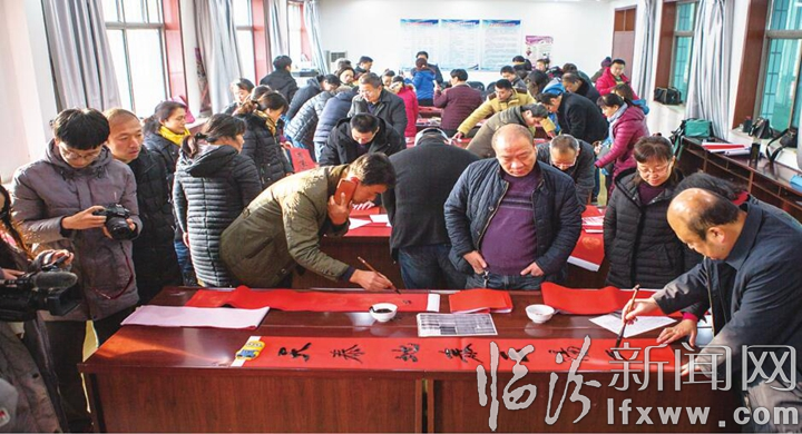 临汾新闻网讯 一月十九日,襄汾丁陶书画院的书法爱好者在为社区居民书写春联。当日,襄汾丁陶书画院组织十余名书法爱好者来到襄汾南庄社区,开展了“写春联,送祝福”活动,在为社区居民送去新春祝福的同时,更好地弘扬了书法这一优秀传统文化。