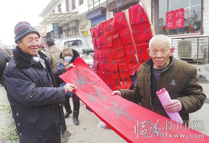 76岁的西徐村翟玉生老人毫不犹豫地买了几副。老人跑了几个集市都没有买到书写的春联。他对记者说,印刷的春联有光泽、漂亮,但闻不到笔墨香,带有墨香的春联才有浓浓的年味。”记者王隰斌摄