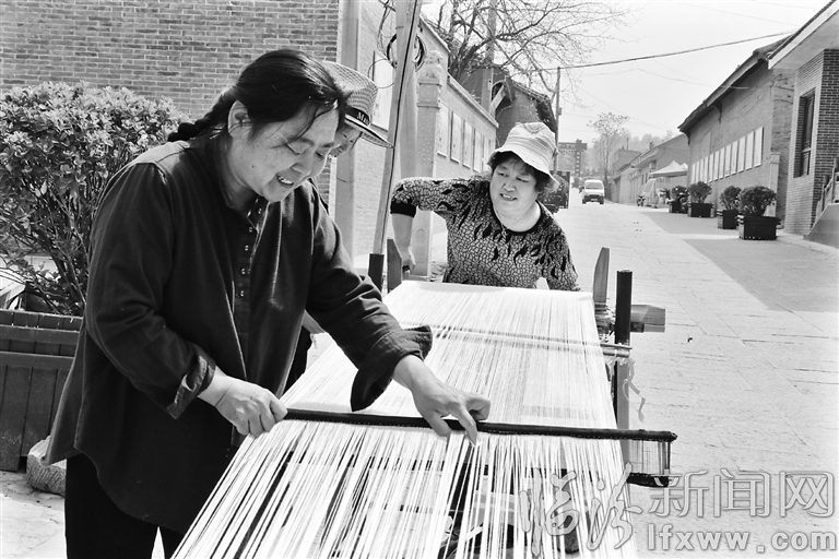 临汾新闻网讯 4月12日,襄汾县丁村主街上,“丁村狗妮”任春秀正和伙伴们“刷线”。刷线是丁村土布大小72道工序中的一道。