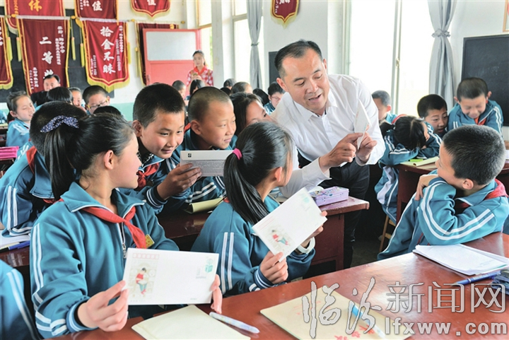 临汾新闻网讯 我市青年集邮协会会长薛钢,近年来一直致力于“爱读书,读好书,善读书”爱心公益活动,联络社会爱心单位送书到校园,受到学校师生欢迎。图为薛钢在襄汾县陶寺小学公益活动中赠送《全民阅读》邮票给孩子们,并为孩子们讲解集邮知识。