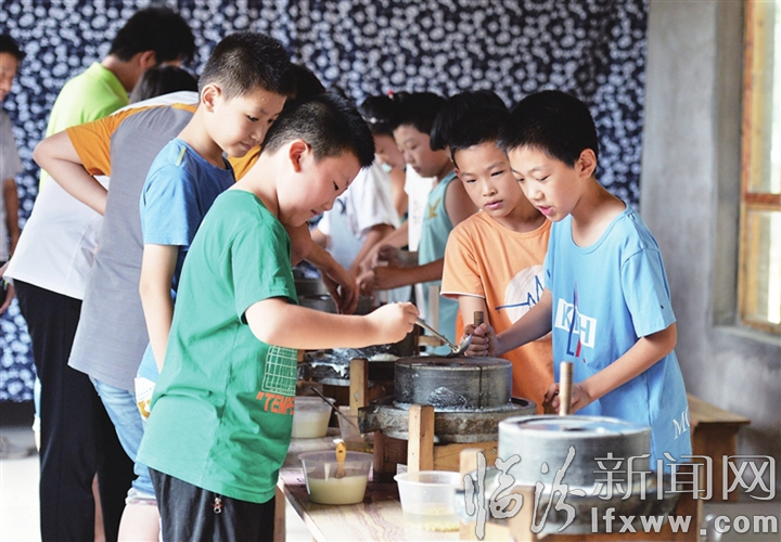 临汾新闻网讯 7月26日,在襄汾县林乡四季庄园农活体验区,孩子们在现场体验手工石磨豆浆。近年来,襄汾县林乡四季庄园结合休闲农业和乡村旅游,大力发展乡村乡土文化、非物质文化遗产项目传承、农业花卉树木科普教育以及户外拓展等丰富多彩的休闲旅游项目,走出了一条农业发展的新路子。