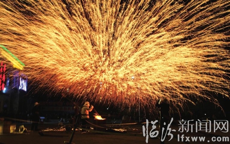 临汾新闻网讯 2018年12月30日,来自河南省孟津县的非遗传承艺人正在襄汾县丁陶风情街表演“打铁花”,迎接2019年的到来。“打铁花”是流传于豫晋地区民间传统的烟火,至今已有千余年的历史。