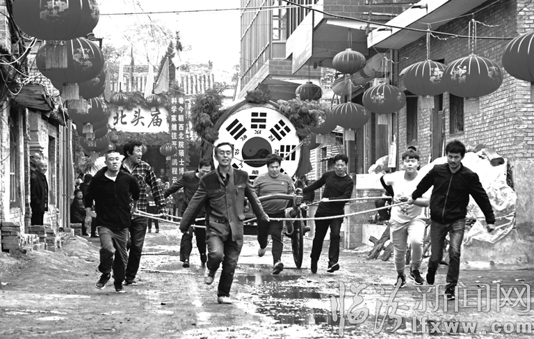 临汾新闻网讯 4月20日,村民冒雨在襄汾县汾城镇尉村进行跑鼓车竞技活动。