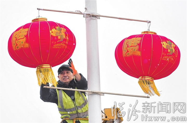 临汾新闻网讯 1月10日,工人在襄汾县大运路城区段悬挂红灯笼,喜迎新春佳节。春节临近,襄汾县的广场、景点、公园和各街道都挂上了喜气洋洋的大红灯笼。