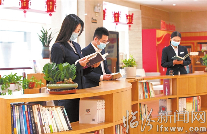 临汾新闻网讯 4月15日,在襄汾县农村商业银行,工作人员在“职工书屋”内阅读图书。
