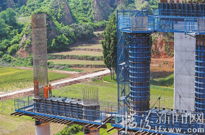 临汾新闻网讯 连日来,襄汾县国道108线(襄汾—曲沃—侯马)过境公路改线工程南沟大桥建设正酣。大型塔吊、推土机等设备马力全开,捆扎钢筋、浇筑混凝土等作业有序推进,施工现场一派紧张忙碌的景象。图为5月24日,工人们正在进行桥梁下部结构作业。