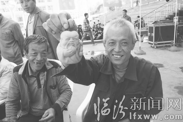 原来,杨振华用模子套在了梨上,结果梨就长成了一个手捧仙桃的“老寿星”。这个“寿星梨”赚足了现场梨农和媒体的眼球。