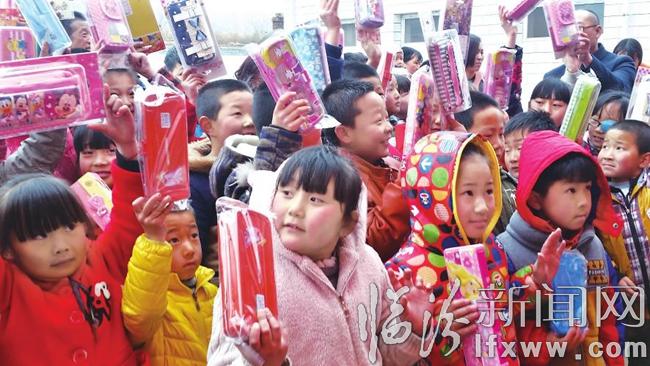 幼儿中班的妞妞,领到的礼物是一只毛茸茸的浣熊,她抱着浣熊高兴地说:“太好了,我最喜欢小熊了。”一年级的鹏鹏则奶声奶气地说:“我的文具盒上有葫芦娃,我要学习葫芦娃的坚强勇敢,好好学习、天天向上。”谙正村小学校长贾晓龙说,孩子们听说今天师大临汾学院艺术系的大哥哥、大姐姐们要来,可高兴了,一大早就来到学校眼巴巴地等着。孩子们遇到了好时候,那么大的毛绒玩具,我们小时候见都没见过。孩子们今天领到的笔袋真好又实用,说真的,作为一校之长,我都没有那么好的一个笔袋。说着,贾晓龙的眼睛里满是感激。
