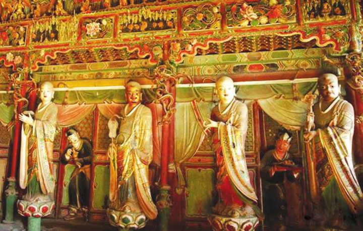 大雄宝殿殿内悬塑大多绘塑于明崇祯十七年(1644年)到清顺治十三年(1656年)之间,殿内悬塑流光溢彩,金碧辉煌,璀璨夺目,精美动人,完整如新。建筑面积仅有216.72平方米,殿堂之内满布彩塑,除佛坛之上的5尊主像外,墙壁、檩柱甚至屋椽之上,皆塑绘着数以千计的彩塑。