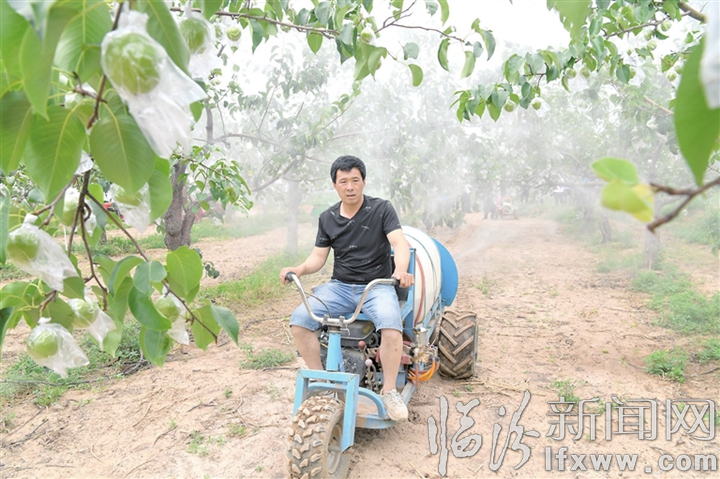 临汾新闻网讯 近年来,隰县善品良田种植专业合作联合社以“联合社+基层合作社+生产小组”为三级组织架构,带动271户社员种植玉露香梨3200亩、苹果1500亩,辐射带动非社员种植梨果两万亩以上。图为合作社工作人员在对梨树进行叶面喷肥。