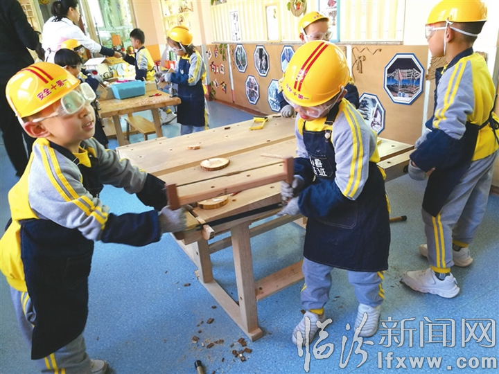 临汾新闻网讯 乡宁县新城区幼儿园围绕“育健康体魄,塑健全人格”的目标,建幼儿游戏启慧园,逐步形成生活了生活、学习、发展为一体的“亲历体验、健康成长”的办园特色,成为乡宁幼教的一张亮丽名片。图为孩子们体验木匠工作。