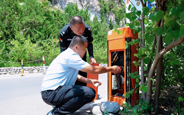 图为王志刚(前排)在景区内巡检设备。新华网 发(王李荣 摄)