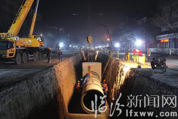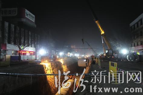 凌晨1点,记者在市区尧丰市场附近的施工现场看到,沿线开挖好的管沟附近集结满了大型吊装机械,正在吊装管道。