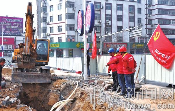 临汾新闻网讯 市区鼓楼南北街拓宽改造工程开工以来,临汾供电公司配电运检室黎明共产党员服务队一直活跃在工作现场,张贴电力设施保护标牌,宣传电力设施保护知识,沿线巡察设备,为施工段的配电设施安全运行发挥了巨大的作用。在电缆管沟施工阶段,他们分组监督各工段施工情况,与施工队同进同出,严格标准,严格验收,确保质量,受到工程指挥部的好评。图为施工现场。(沈慧玲)