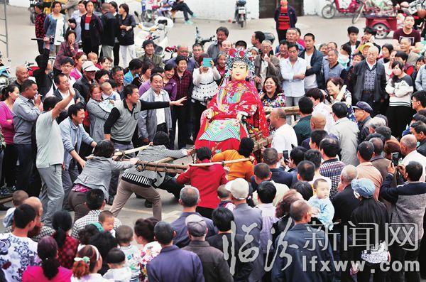 临汾新闻网讯 本着将舞台还给百姓、让村民自娱自乐的宗旨,尧都区泊庄村日前举办了首届百姓舞台群众文化艺术节。活动中,一些村民登台亮相,展示才艺,前来助兴的杨氏太极拳协会的精彩表演更是赢得了大家的热烈掌声。活动期间,该村举办的延续了几百年的传统民间民俗活动“推娘娘”,将文化艺术节活动推到了高潮,十里八乡的乡亲们纷纷前来观看。图为“推娘娘”比赛现场。 (张旦)摄