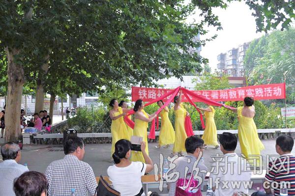 临汾新闻网讯 为了丰富孩子们的暑期生活,日前,尧都区车站街办事处铁路社区党支部与市第三小学,举办了暑假学生融入社区文艺活动,让学生们在活动中享受快乐、受到教育。图为社区大妈们正在表演文艺节目。周云瑞 摄